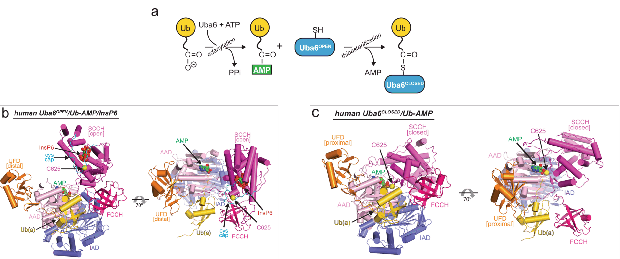 Uba6 is an E1 enzyme that initiates signal transduction by activating ubiquitin and the ubiquitin-like protein FAT10 in a two-step process involving sequential catalysis of adenylation and thioester bond formation. By determining the crystal structure of a human Uba6-ubiquitin complex, two distinct architectures were observed: one in which Uba6 adopts an open conformation (with the active site configured for catalysis of adenylation), and a second drastically different closed conformation in which the adenylation active site is disassembled and reconfigured for catalysis of thioester bond formation. Surprisingly, one molecule of the important cellular metabolite inositol hexakisphosphate (InsP6) was found to bind a previously unidentified allosteric site on Uba6. Our data indicate that InsP6 binding not only enhances Uba6 stability but also inhibits its activity by altering interconversion of the open and closed conformation. Thus, in addition to revealing the molecular mechanisms of catalysis by Uba6 and allosteric regulation of its activities, our data* provide a framework for developing Uba6-specific inhibitors and raise the possibility of allosteric regulation of other E1s by naturally occurring cellular metabolites.